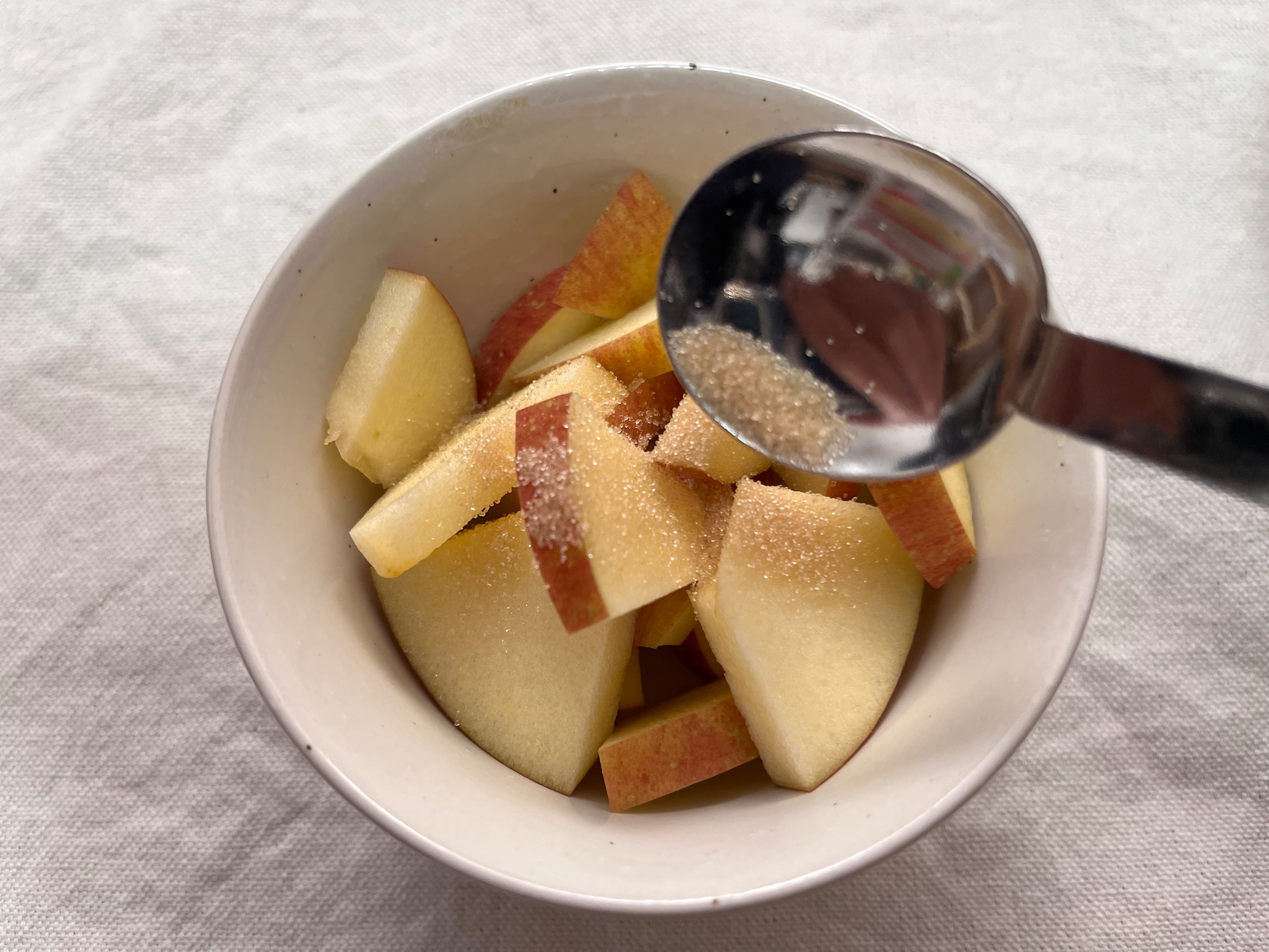 加熱すると、りんごの果汁がじゅわーっとしみ出てきます。ぜひ果汁も楽しんでください🍎
