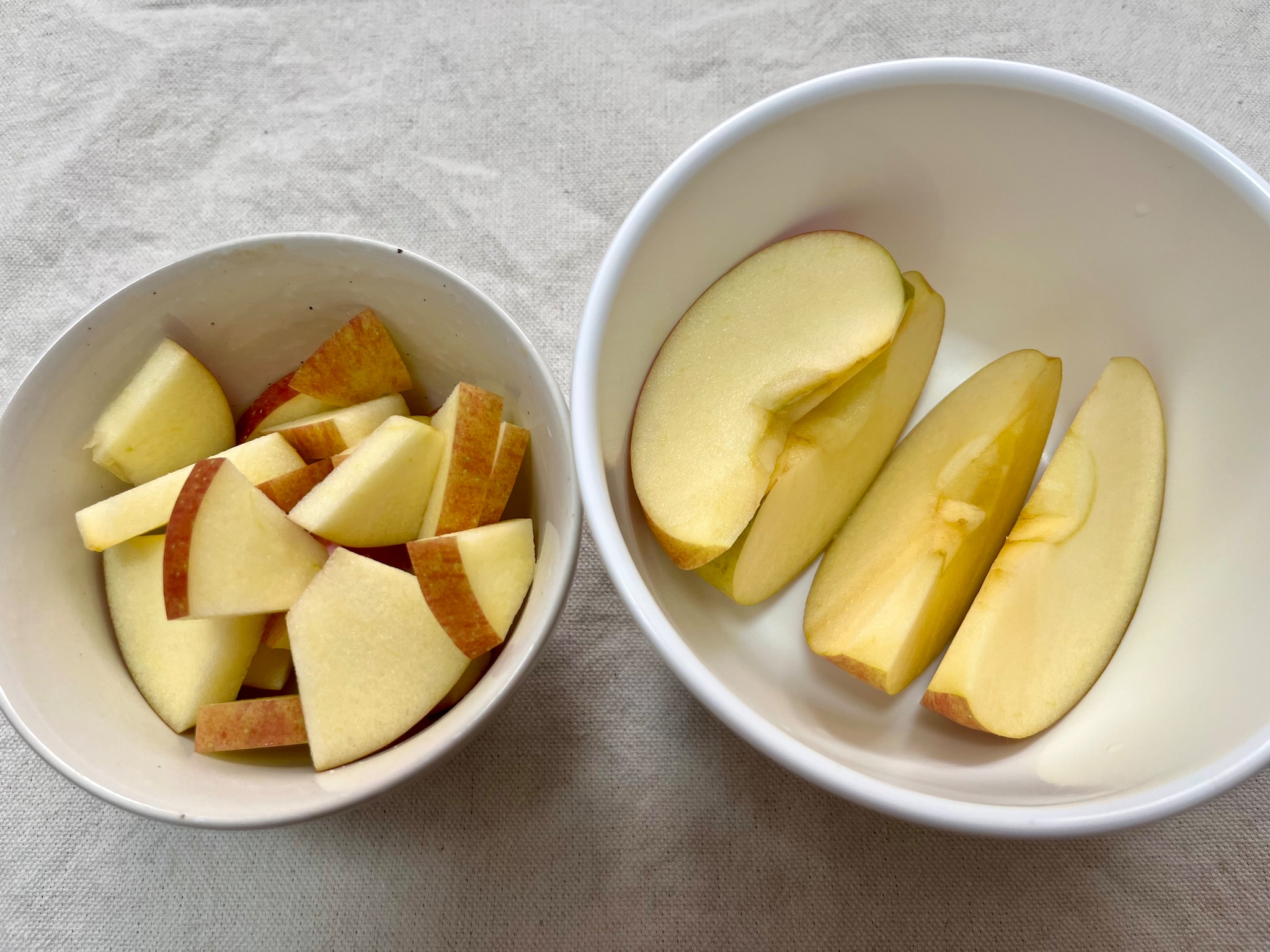 ②切ったりんごを、電子レンジ対応容器へ移す。