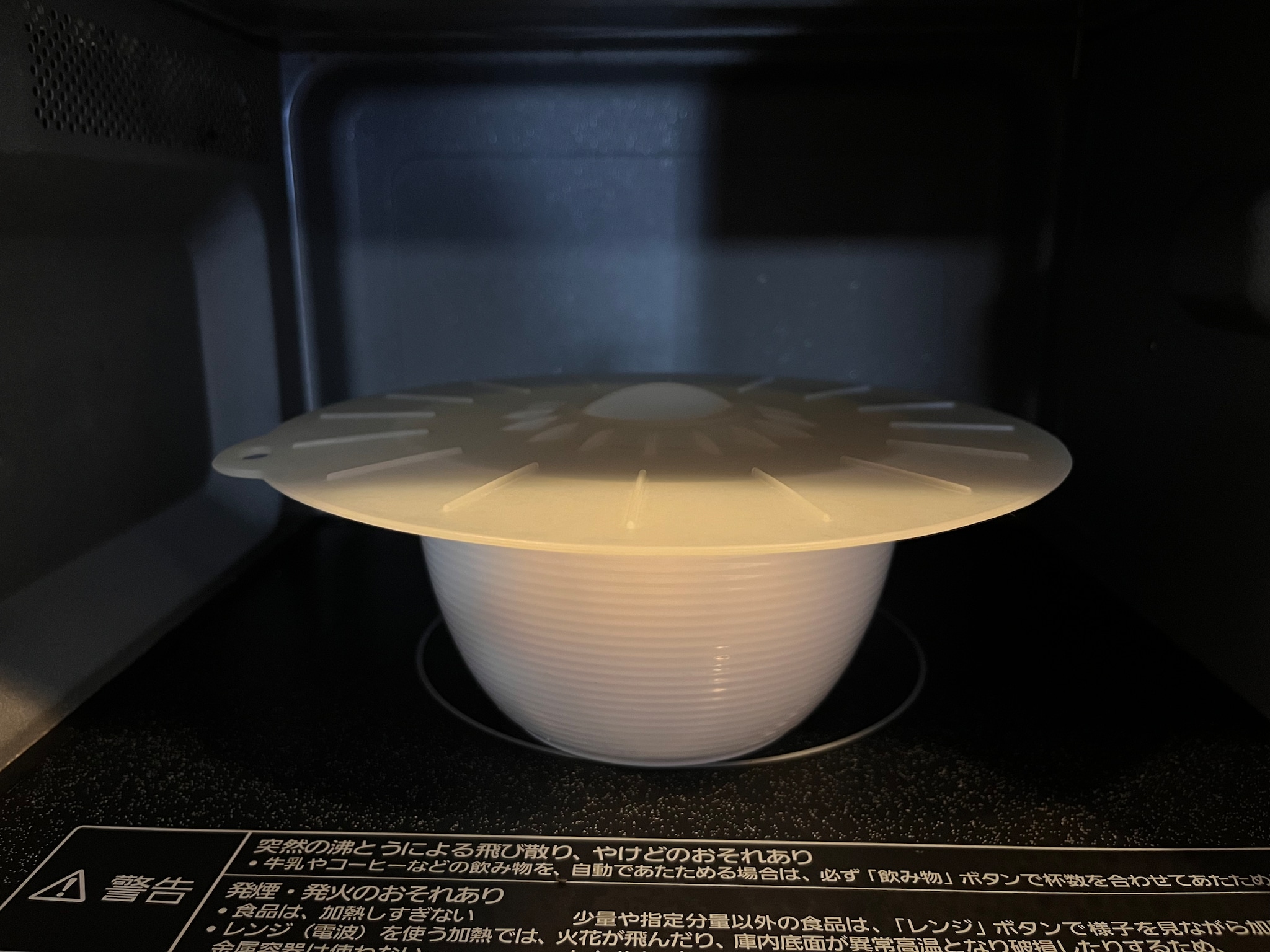 ④容器にラップを被せて、電子レンジ600Wで加熱。