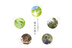 良質な土(地)、水(水)、包み込む太陽の光(火)、優しく吹き抜ける風(風)、そして最後に「人」の力。自然の恵みを最大限に活かすことが私たちの役目と考え、「地水火風人」にこだわった農法でりんごを育てています。